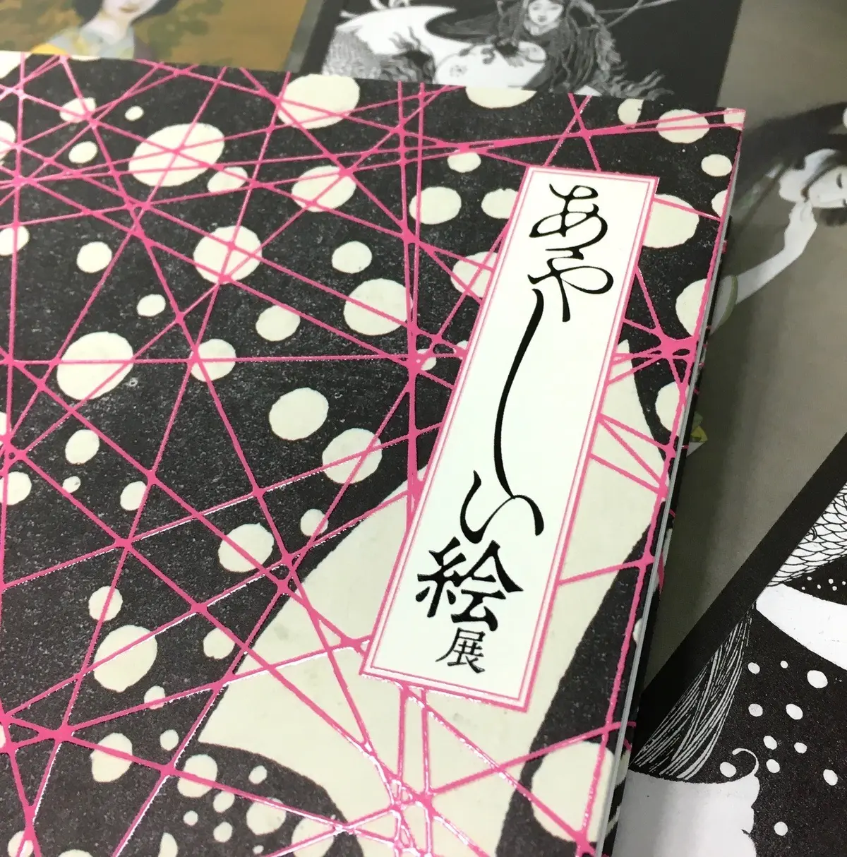 展覧会の何がいいってまず図録✨ 出品作品のパワーが、デザイナー魂に火をつけた感じがします。厚盛印刷によるピンクの網が水玉の上にツヤツヤ光って、カッコいい。