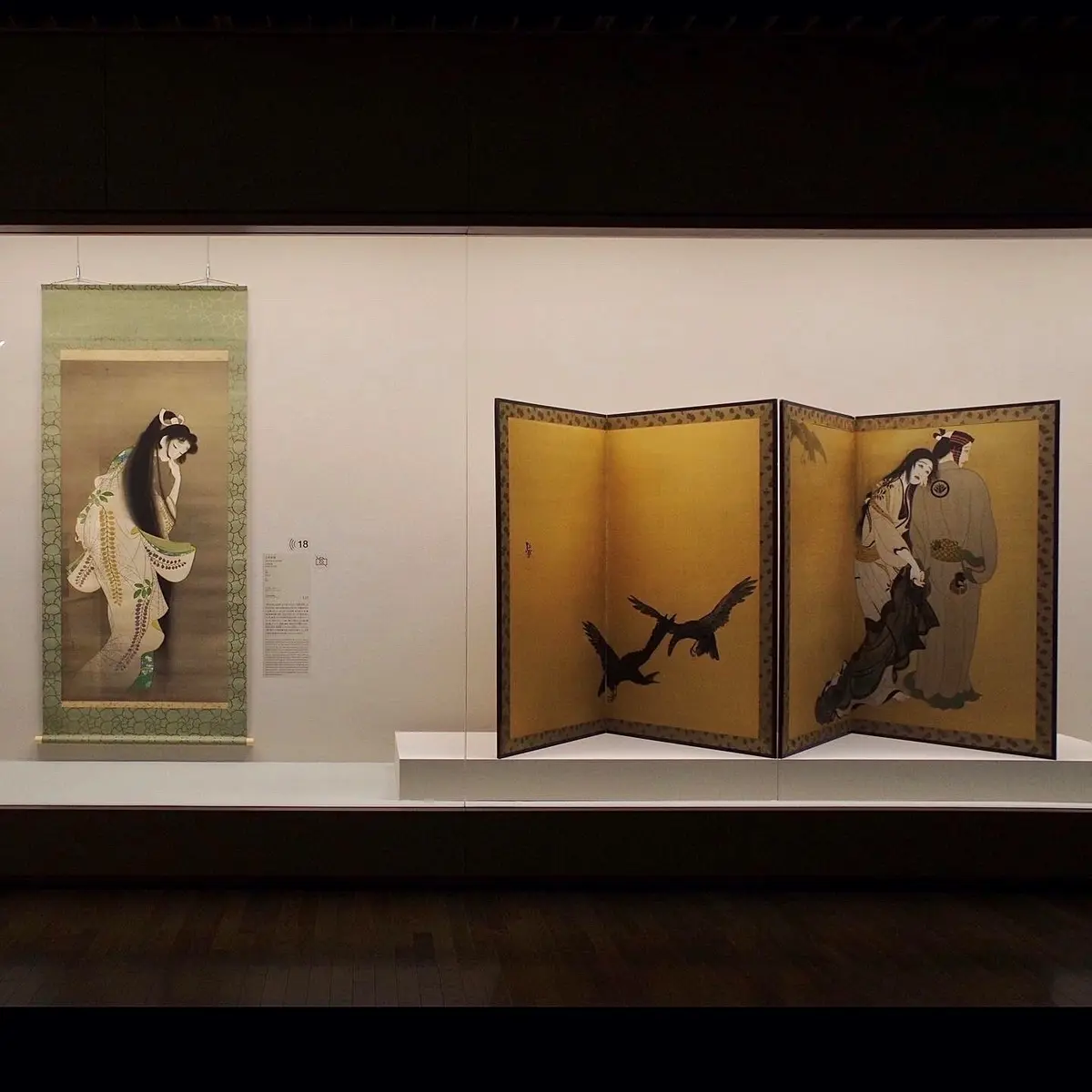 写真2枚目右は北野恒富『道行』(こちらも展示は4/4まで)。この作品、「あやしい絵」にありがちな陰影感が薄く、かなり整理された印象ながら、なかなかに不気味です。恒富ほど作風を目まぐるしく変えた画家も珍しいですが、こちらは西洋画的要素と近世絵画的要素が混然と溶け合った稀有な例ではないでしょうか。本誌ではスペースの都合で近世絵画の例として『本多平八郎姿絵屛風』を載せましたが、『彦根屛風』からの影響が強いように感じます。