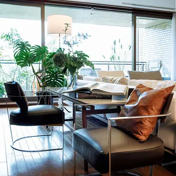 テラスに置いた鉢植えの観葉植物が、敷地内に植えられた大きなケヤキや桜の木との景色をつないでくれている。窓辺のコルビュジェのシェーズロングに寝そべってくつろぐのは至福の時間。