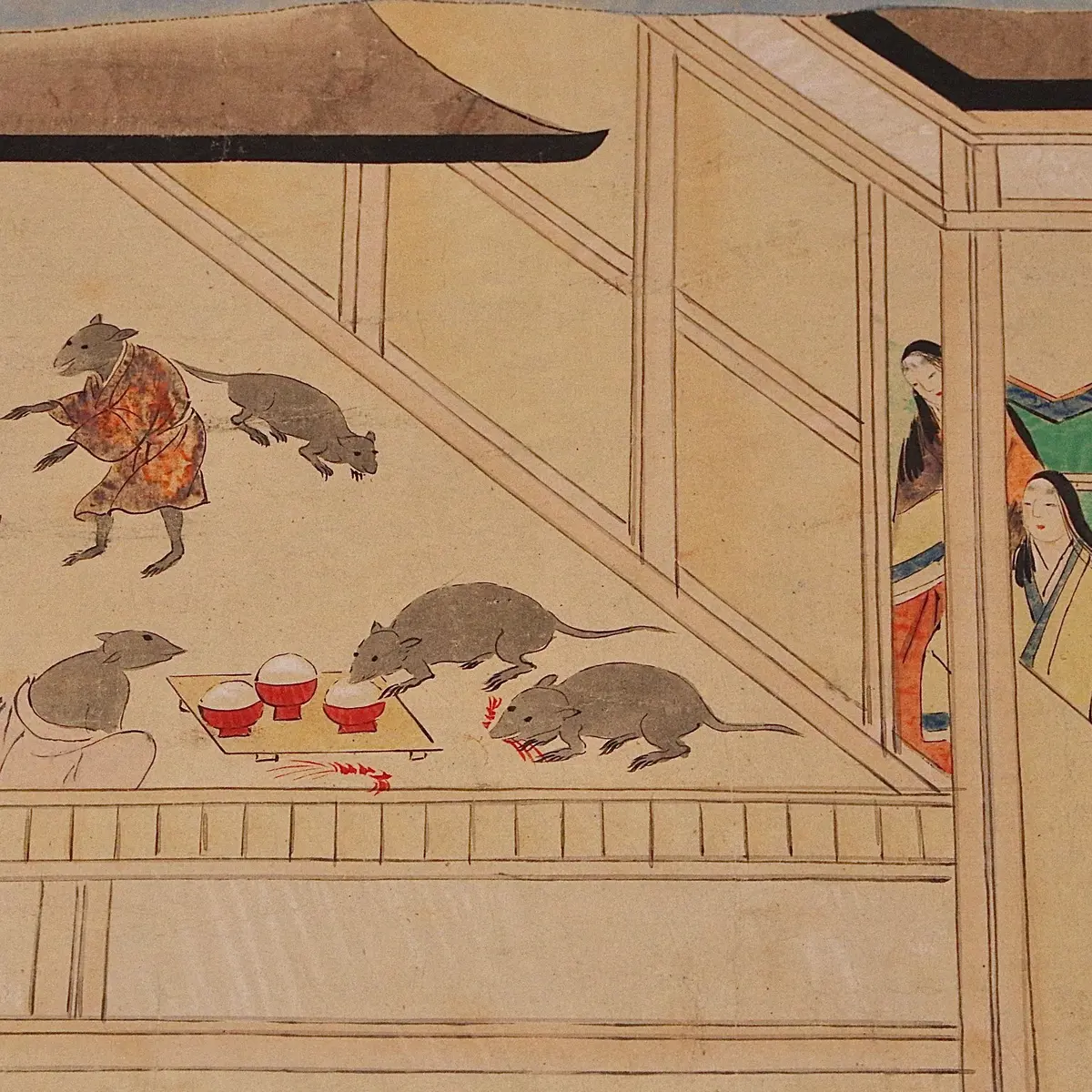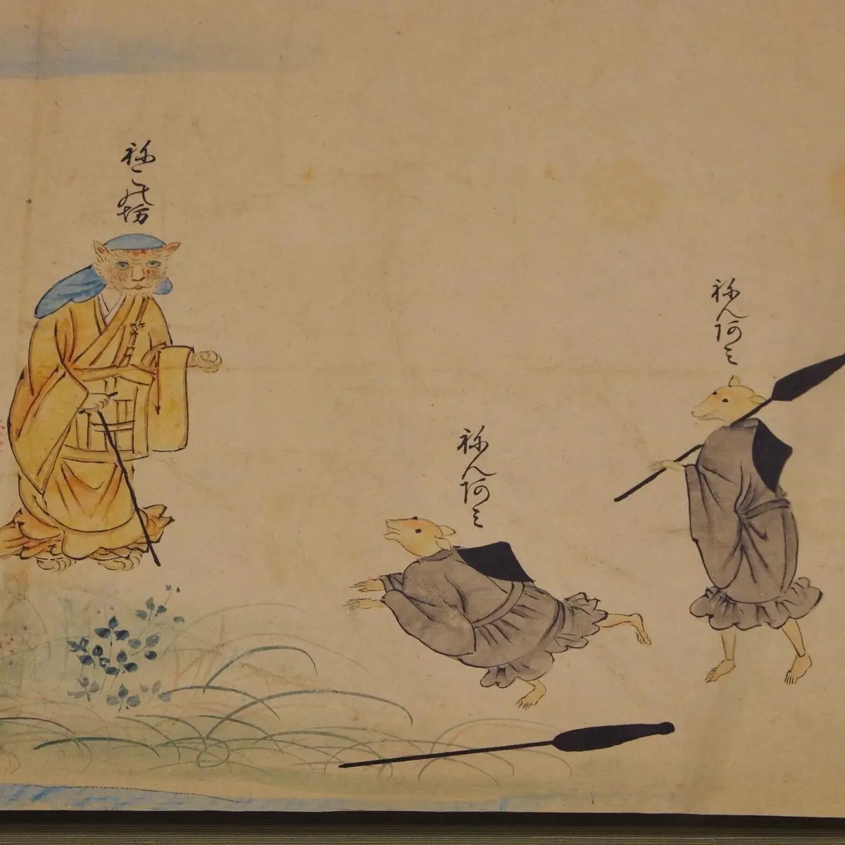 動物モチーフの作品で誰もが目を留めるのは、異類婚姻譚の『鼠草紙』でしょう(展示は~7/4)。御伽草子に漂うののほんとした空気が『鳥獣戯画』との近しさを感じさせます。写真1枚目は、鼠の権頭のもとへ嫁いだ長者の娘が「何か変だな」と思い、ついに真実を知ってしまう場面。鼠がカピバラサイズなのでギョッとします。2枚目は、姫に逃げられて出家した権頭が、修行途中で猫の坊に出くわして恐怖するシーン。鼠にはいずれも「ねん阿弥」と書かれていますので、『鳥獣戯画』甲巻の冒頭でバックロールエントリーをかますうさぎちゃんと同じ、異時同図法ですね。