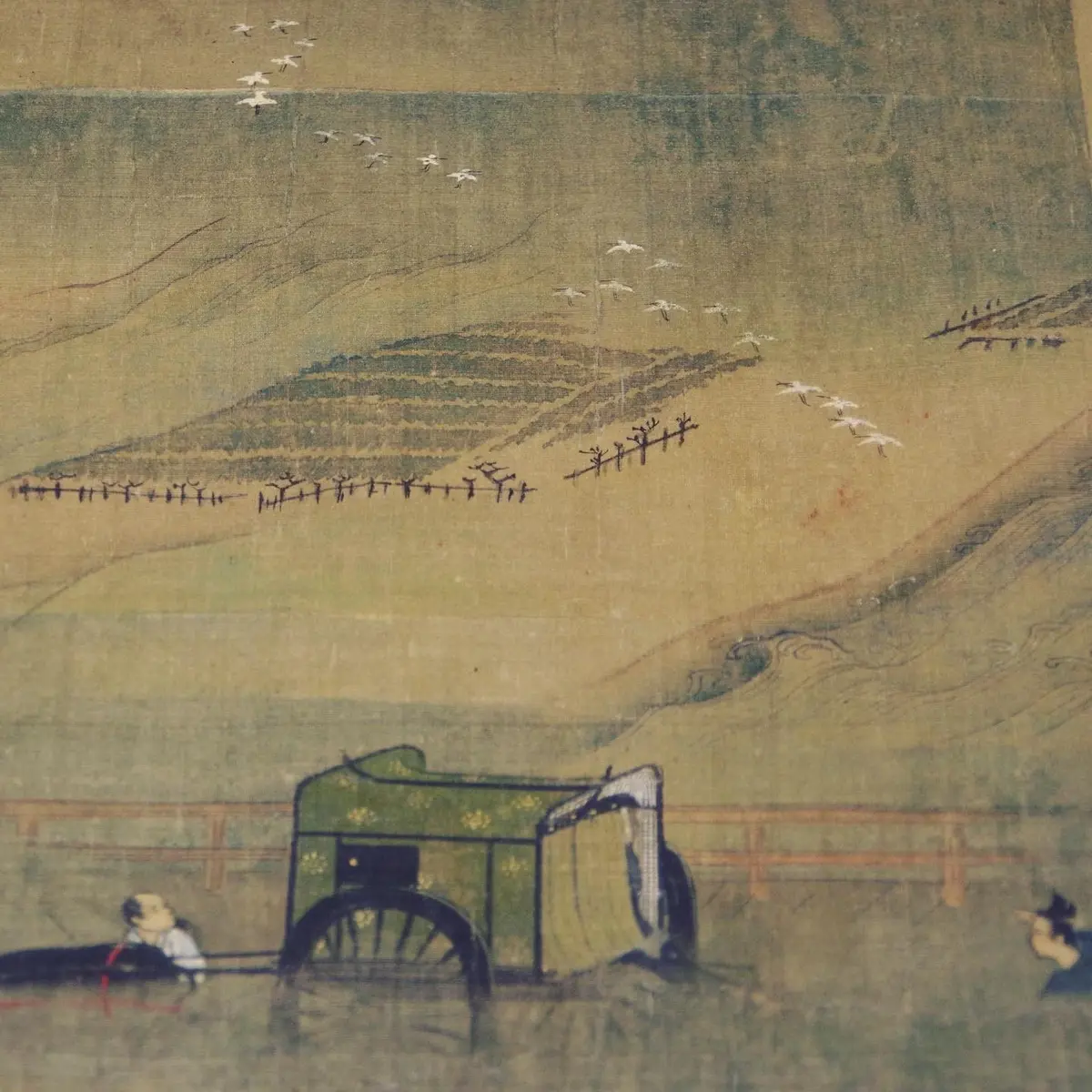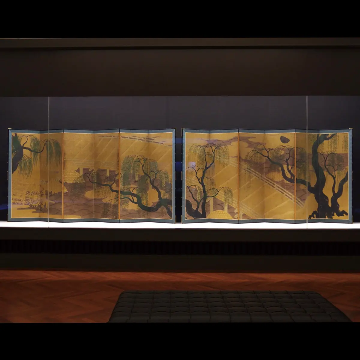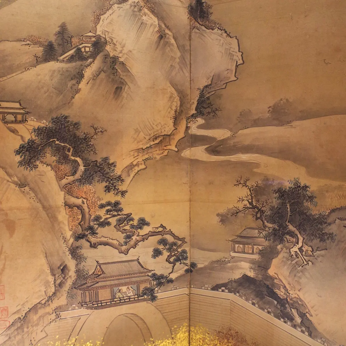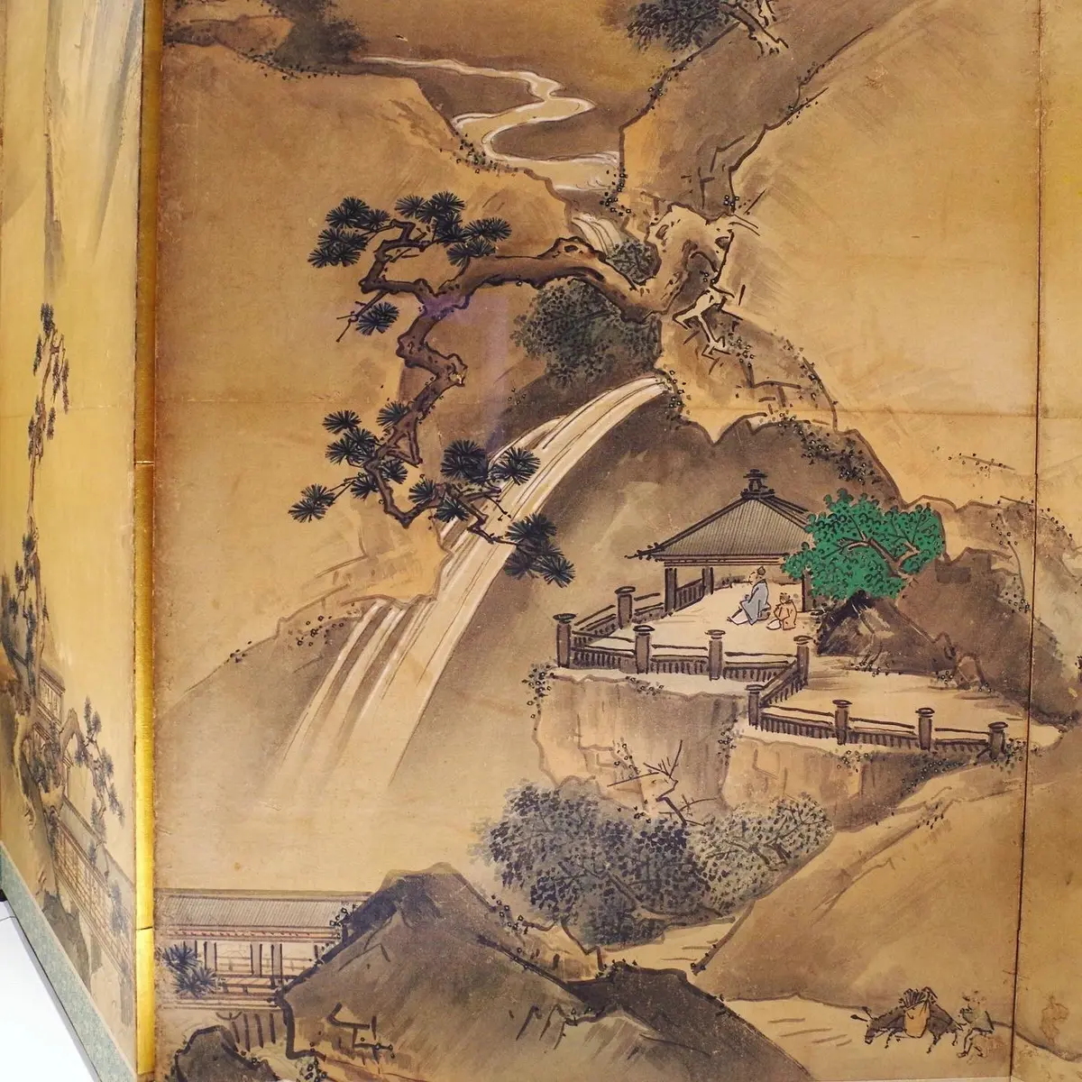 これら探幽、応挙の作品が並ぶ展示室の手前には、大型作品が三方に置かれる「屏風と襖絵」の部屋があります。現在のメインは長谷川派が得意とした『柳橋水車図屛風』(写真3枚目)。個人的には、探幽の師匠で瀟洒な画風の祖というべき狩野興以の『山水図屛風』(写真4、5枚目)も好ましく、目の保養になりました。探幽、応挙、興以の作品、『柳橋水車図屛風』は7/11までの展示です。