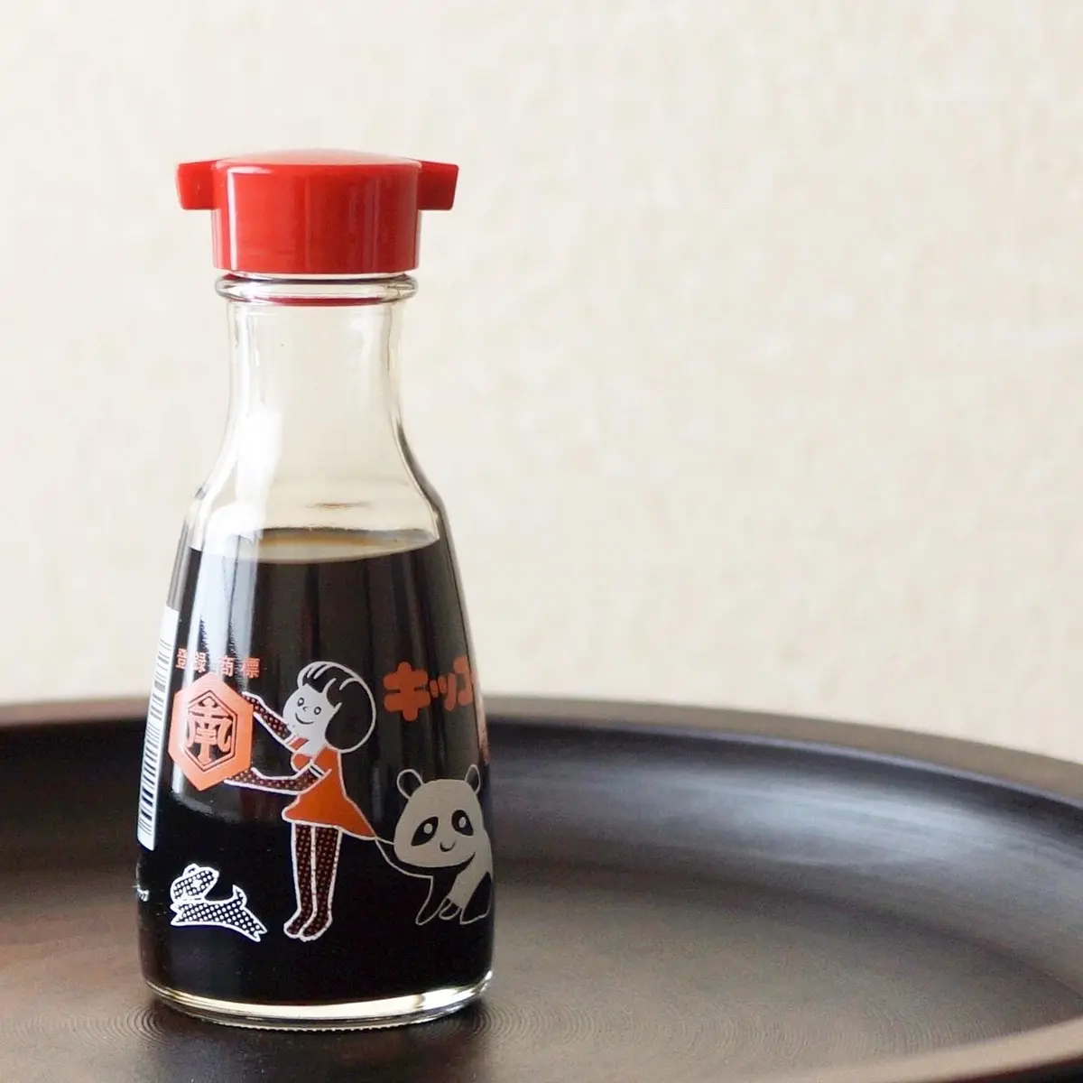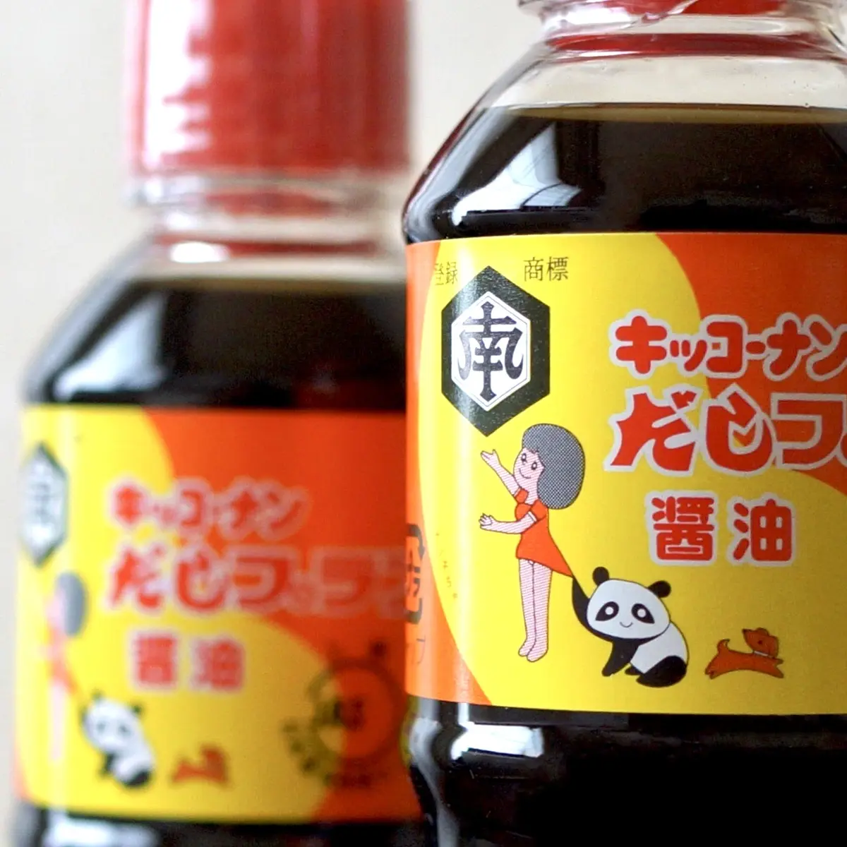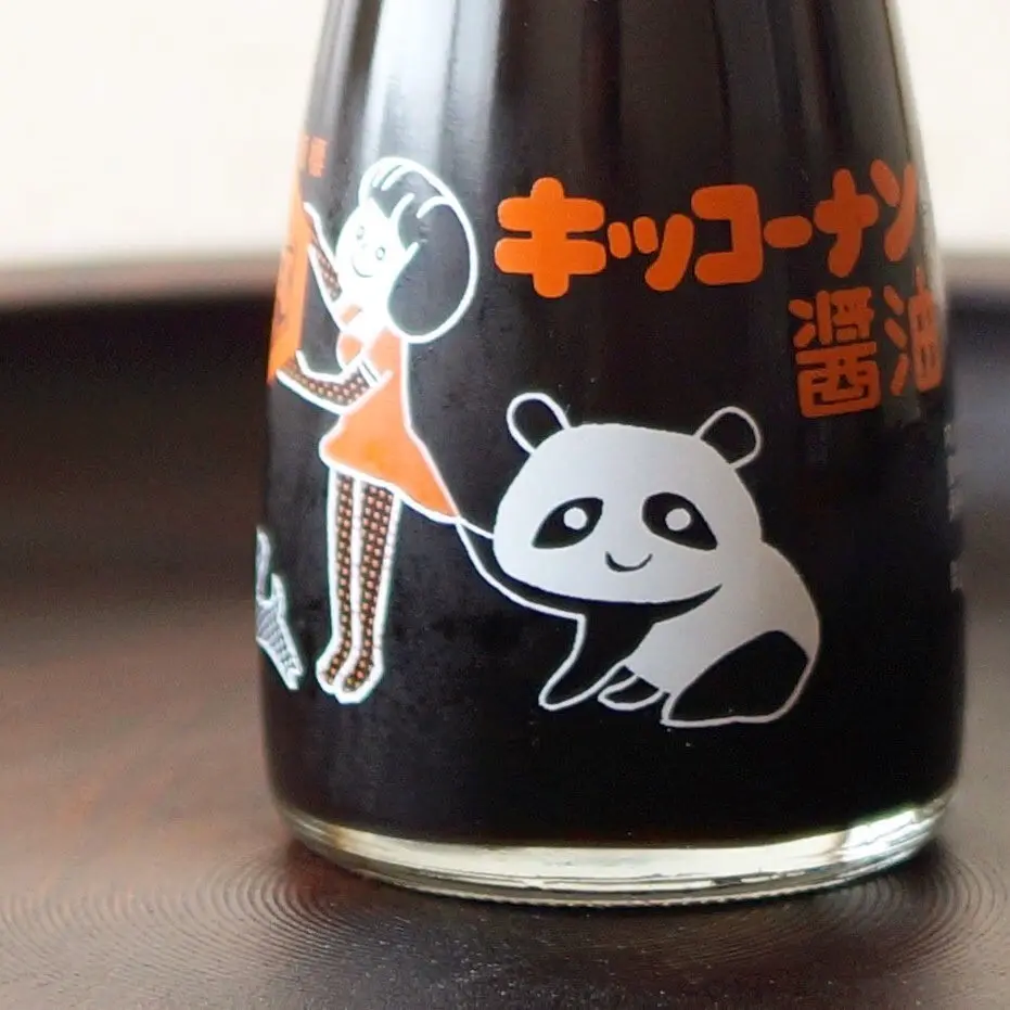 かつて秋田で見かけてグッと来た、キッコーナン製「だしプラス醤油」。醤油の黒が入って初めて白黒パンダが完成するデザインが素晴らしい。(※写真の中身は他社製)
