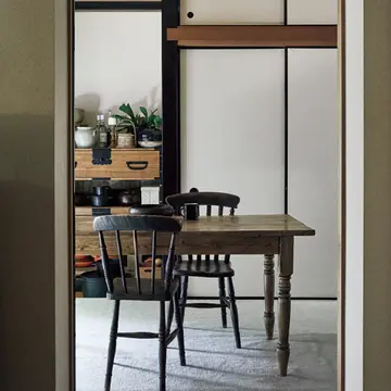 窓を開け、キッチンに立つと開放感のあるこの景色が広がる。床はヘリンボーン張り。向かって右側のアンティークの机は、撮影時にスタイリストさんが器などを置く台として活用。ダイニングテーブルはタイムアンドスタイルで購入。ダイニングチェアは大好きなアメリカのヴィンテージ。