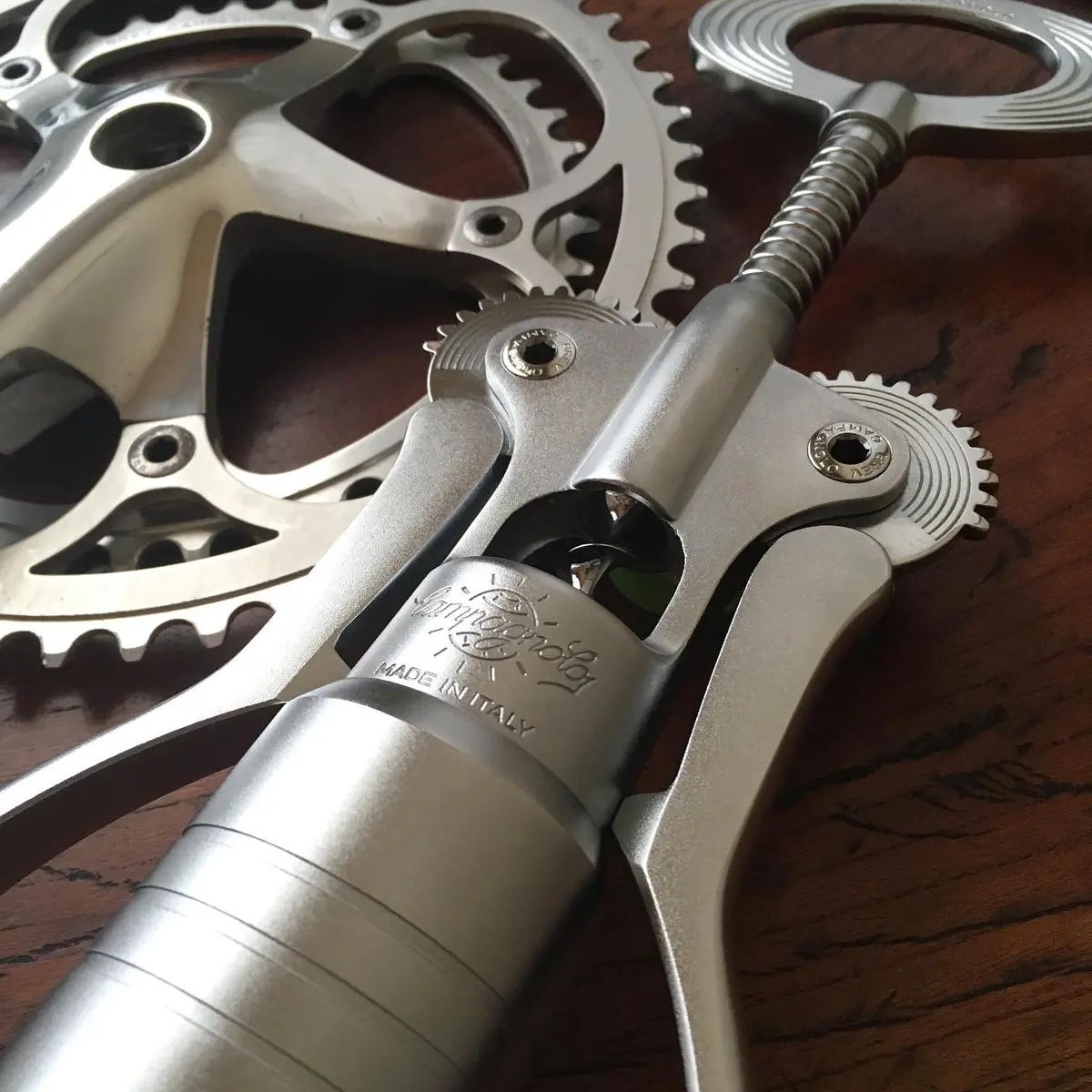 もともとは創業者のトゥーリオ・カンパニョーロ氏が、祝杯の場面で確実かつ安全に抜栓できるようデザインしたもの。古き良き時代の美しきコンポーネントの趣きがあります。