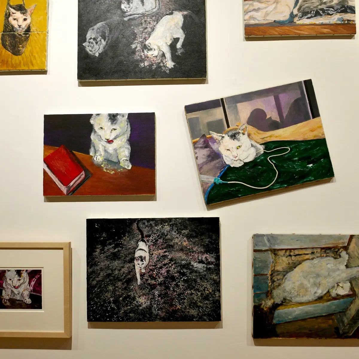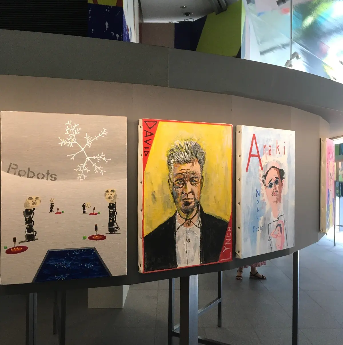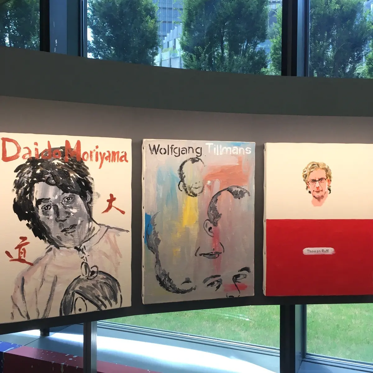 2つめは六本木。『横尾忠則:The Artists』(21_21 DESIGN SIGHT ギャラリー3、~10/17)では、横尾さんが手がけた139のポートレイトを展示しています。肖像の主は、これまでにパリのカルティエ現代美術財団で展覧会を開いた、あるいはそのテーマとなったアーティスト、思想家、科学者たち(モノもありました)。モデルそれぞれに表現が異なり、画面構成、色使いや文字の入れ方がグラフィカルでカッコいい。小ぶりのキャンバスでサイズが揃い、テーマもごくシンプルなので、カオスな横尾ワールドに免疫のない人でもクラクラすることなく鑑賞できるはず。