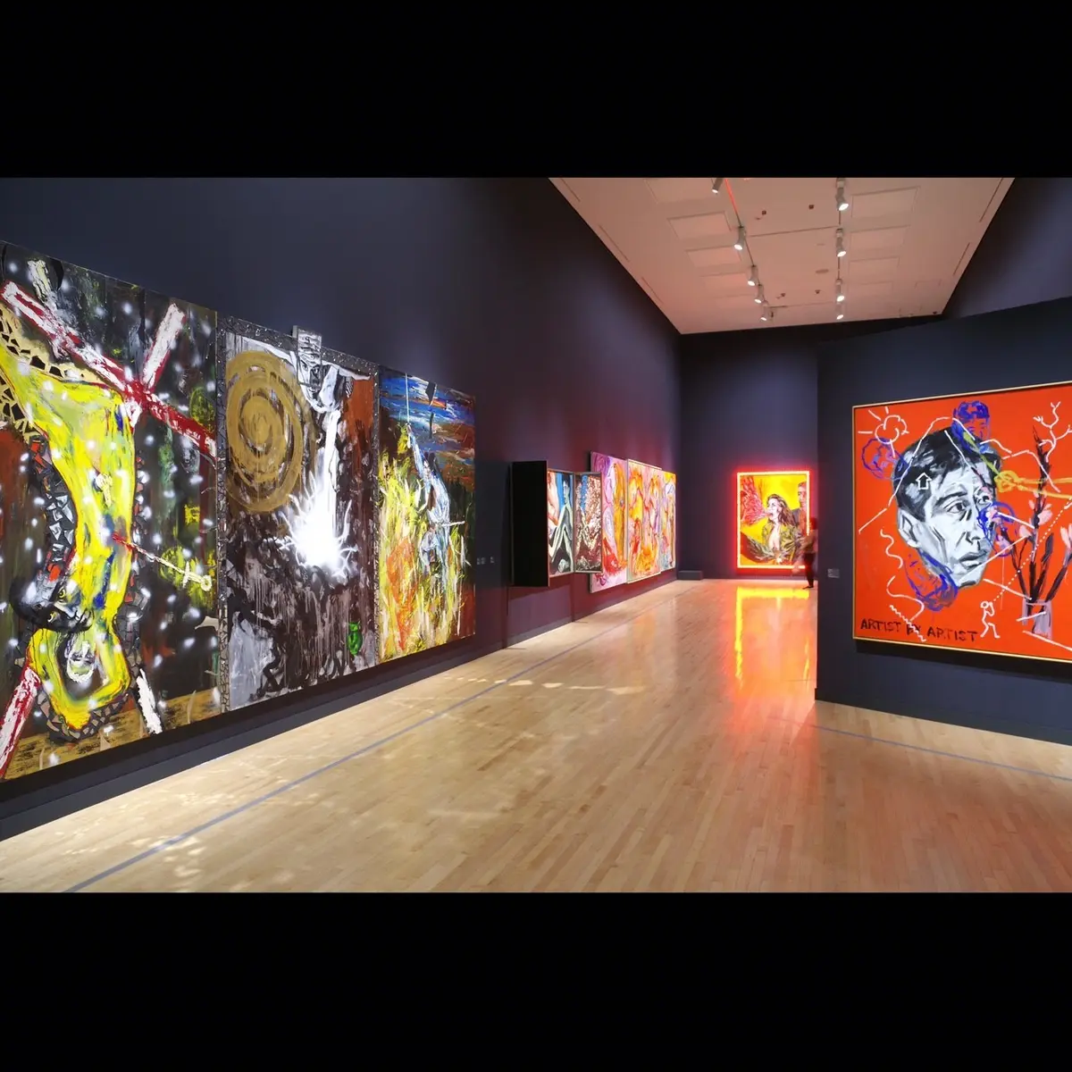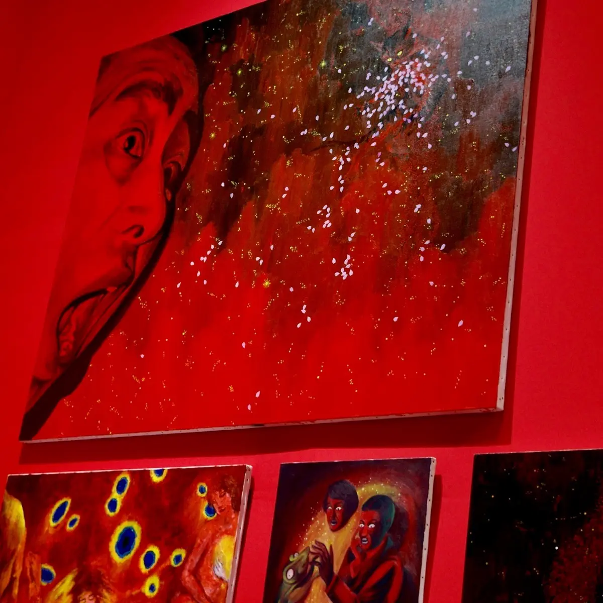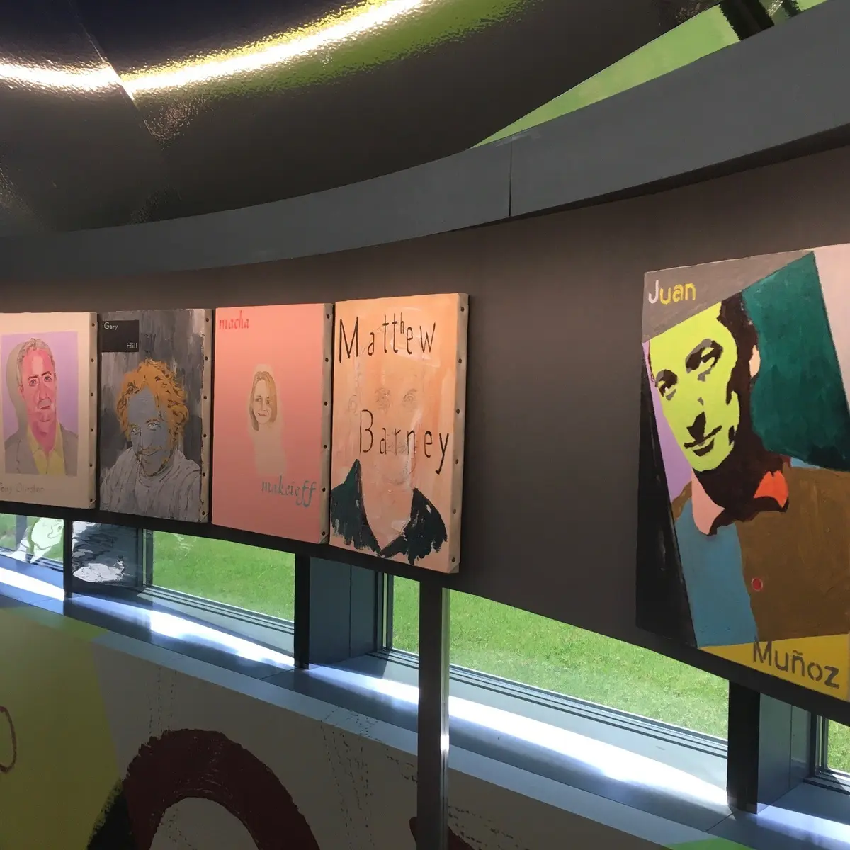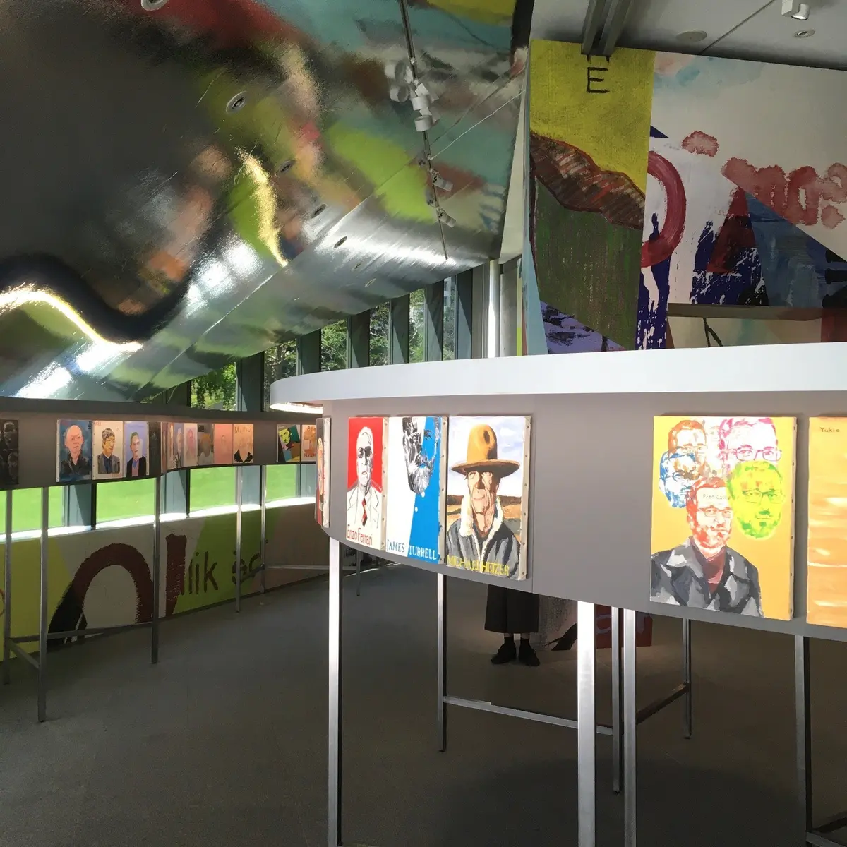 2つめは六本木。『横尾忠則:The Artists』(21_21 DESIGN SIGHT ギャラリー3、~10/17)では、横尾さんが手がけた139のポートレイトを展示しています。肖像の主は、これまでにパリのカルティエ現代美術財団で展覧会を開いた、あるいはそのテーマとなったアーティスト、思想家、科学者たち(モノもありました)。モデルそれぞれに表現が異なり、画面構成、色使いや文字の入れ方がグラフィカルでカッコいい。小ぶりのキャンバスでサイズが揃い、テーマもごくシンプルなので、カオスな横尾ワールドに免疫のない人でもクラクラすることなく鑑賞できるはず。