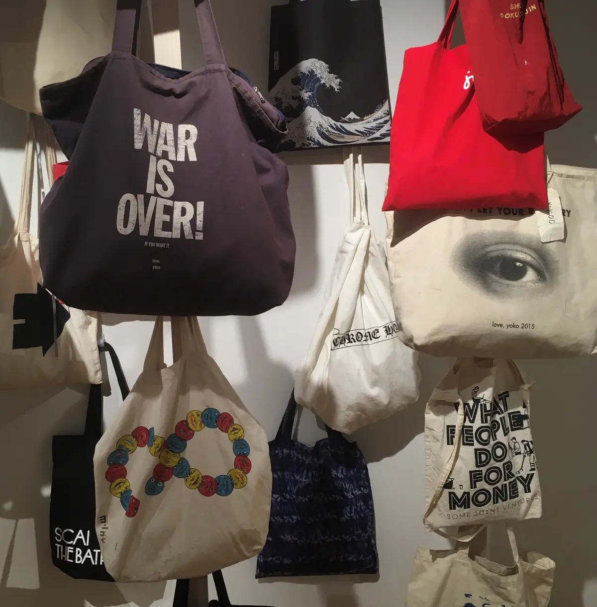 展示の主役はご愛用品の数々。トートバッグにレコード、アロハシャツ、そして病院のベッドまで。何だか卓球のラケットがベロに見えて仕方がなかったです。手書きのツイッター用原稿もありました。展示の最後には横尾さんへのメッセージを書くハガキと投函用ポストも設置されていますので、一筆どうぞ。4Fの「ほぼ日カルチャん」でも、横尾忠則グッズの取り扱いあり。