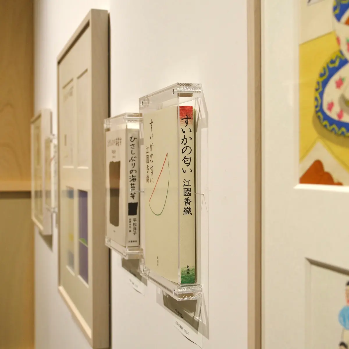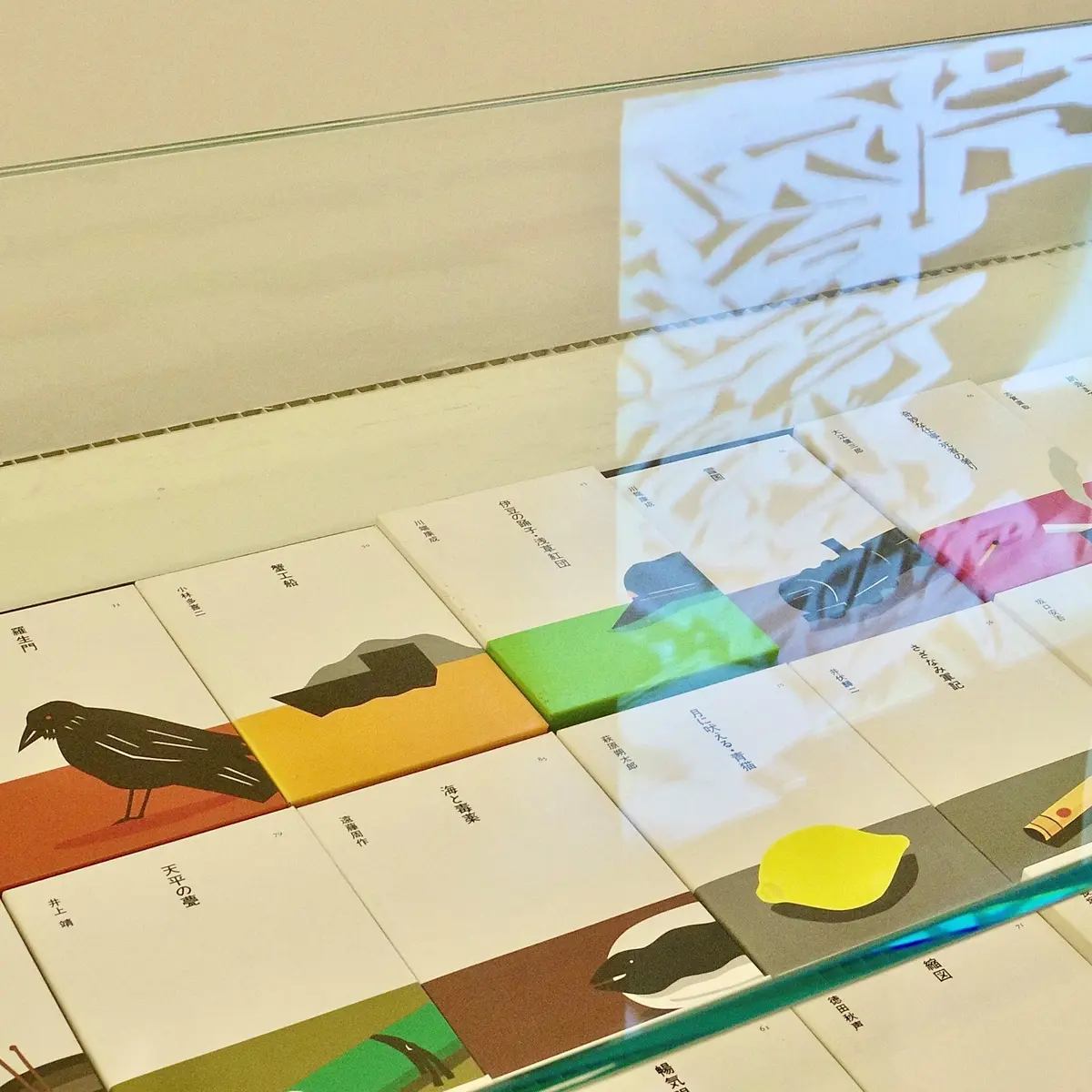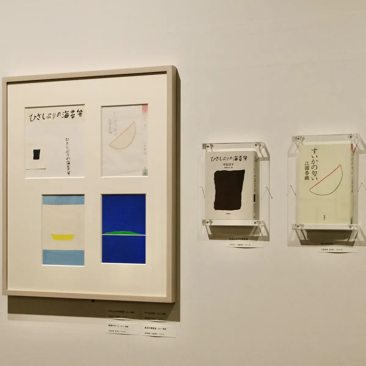 水丸さんの絵は、一歩引いているようでいながら本質を捉えていて、見飽きることがありません。その特質がよく発揮されているのが、ミニマムな装丁だと思います。『ひさしぶりの海苔弁』のカバーは、ペンの太・細で書いた文字と、大きめの切手くらいのもわもわした黒いのが原材料。『すいかの匂い』や『神様のボート』なども要素が少なくてびっくり。でも、きちんと洗練されているからスゴイのです。切り紙絵スタイルの『日本の文学』(近代編)がズラっと並んでいるのも圧巻でした。