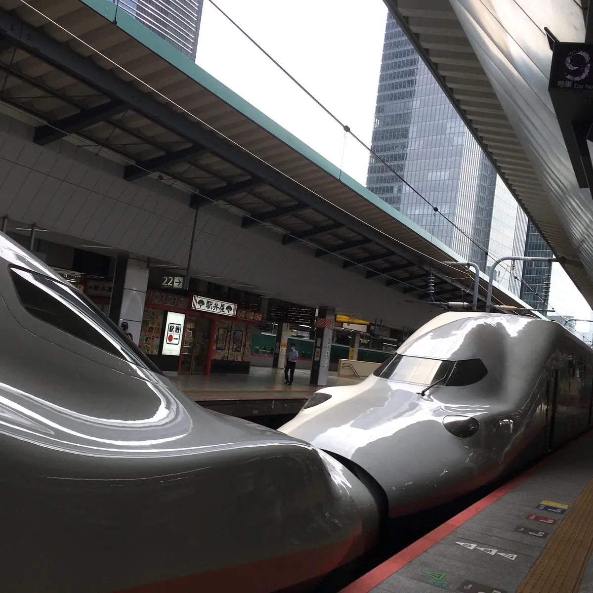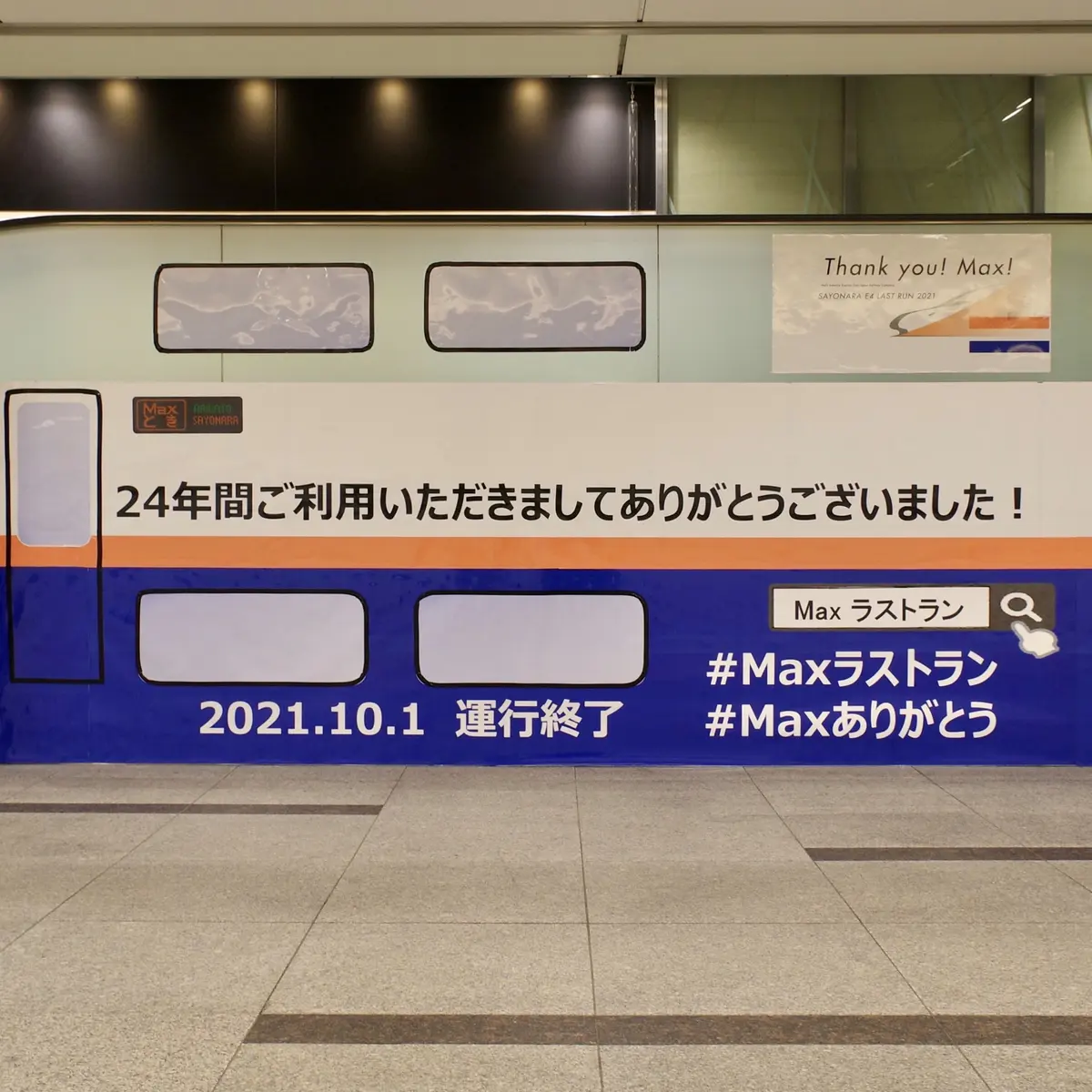 あの2階建て新幹線車両を、途中に踊り場がある独特なエスカレーターの形に見立てたところで、もう100点☆ LEDの行先表示はラストランに合わせて「ARIGATO/SAYONARA」と抜かりなく、足回りの車輪にも目を配るあたり、企画した人はタダモノではありません。しかも、このデコレーションは8月から始まっていて、当初はイエローライン(=初代カラー)だったとか。何でしょう、この「わかってますよ感」。まるで老舗名旅館のおもてなしのような行き届き具合です。E4系への愛の深さに、思わずうれし泣きムードに。