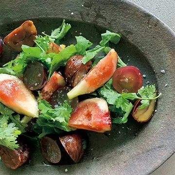 グランピエで買ったφ24㎝のアフガニスタンの器。シンプルなサラダやフルーツをざっくりと、きれいに盛りつけなくてもよく映えます。ふだんはシンプルな料理が多いので、柄のあるものや民芸の器を選ぶことが多いです。ガラスも好きで、好き!と思う直感で器を選んでいますが、不思議と違和感なくまとまり、自分の世界になっています。