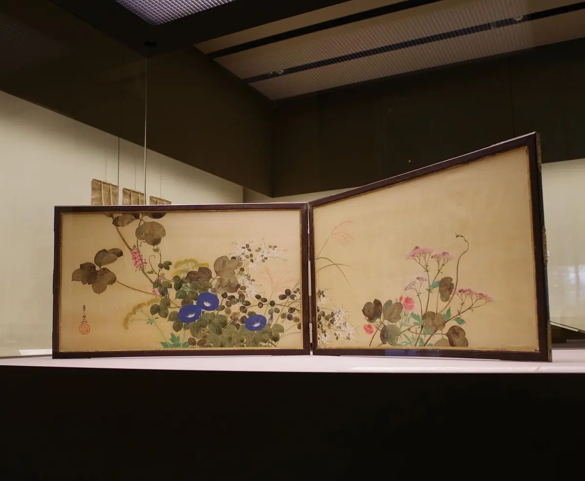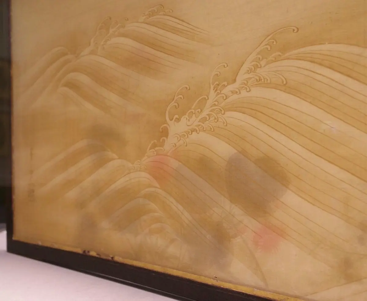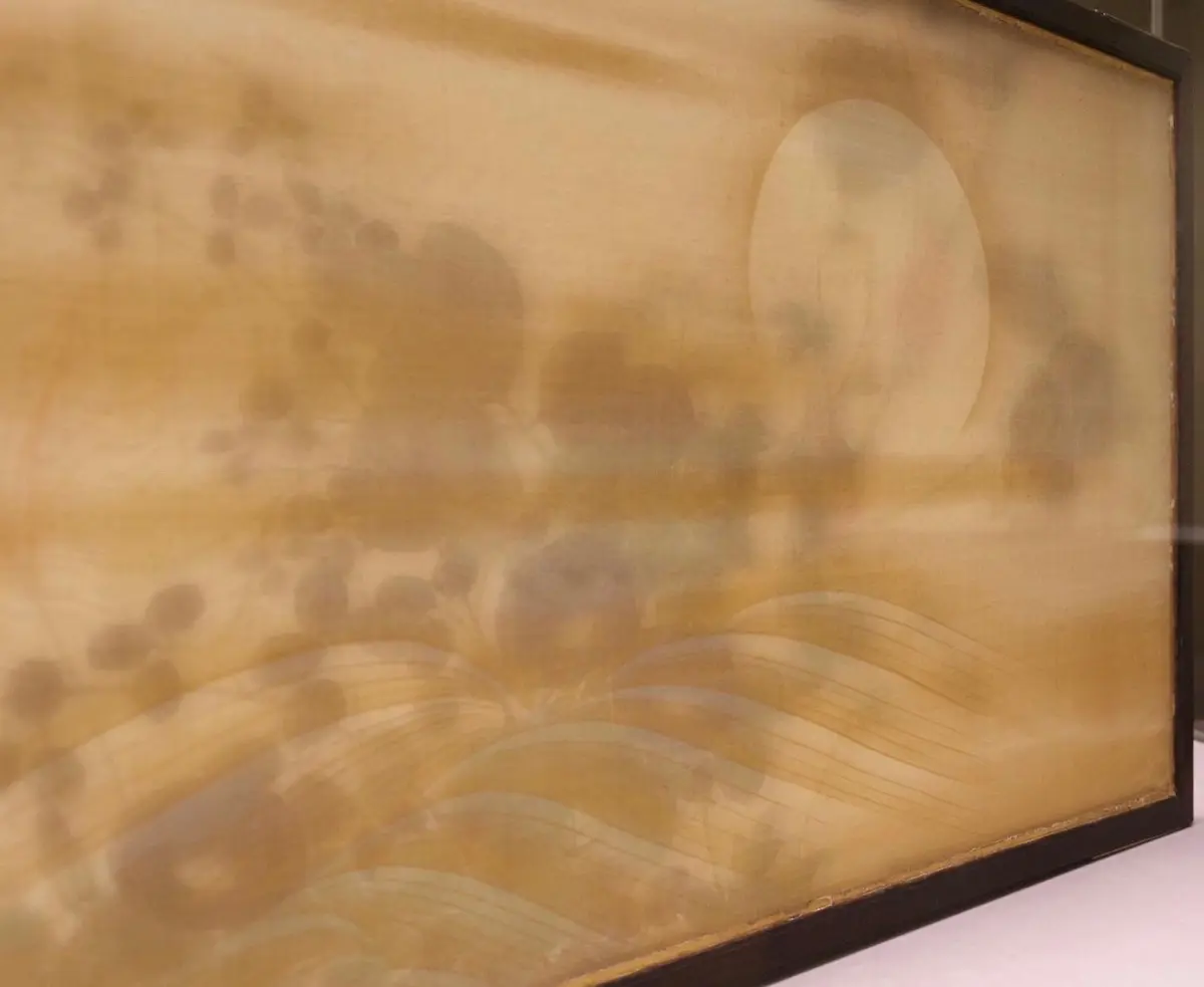 最後に、『夏秋渓流図屏風』と対照的ながら、其一らしい作品をひとつ。『秋草・波に月図屏風』という風炉先屏風ふうの二曲屏風です。抱一譲りの秋草の描写が洒落ていますね。描き方はやや類型化していますが、花や穂などのディテールまで丁寧で抜かりありません。さて現物を前にすると、通常の絹本よりどことなく絵が柔らかく見えます。それもそのはず。この絵には裏打ちがされていないのです。反対側にも裏打ちなしの絹地に金泥で月と波の絵が描かれていて、よく見るとそれが表側からもほんのり透けている!
