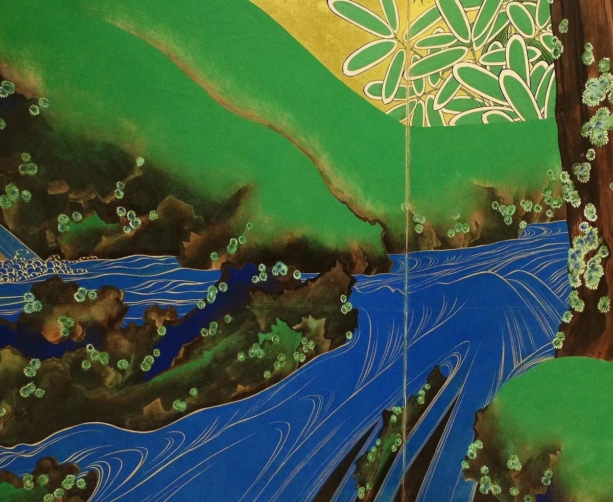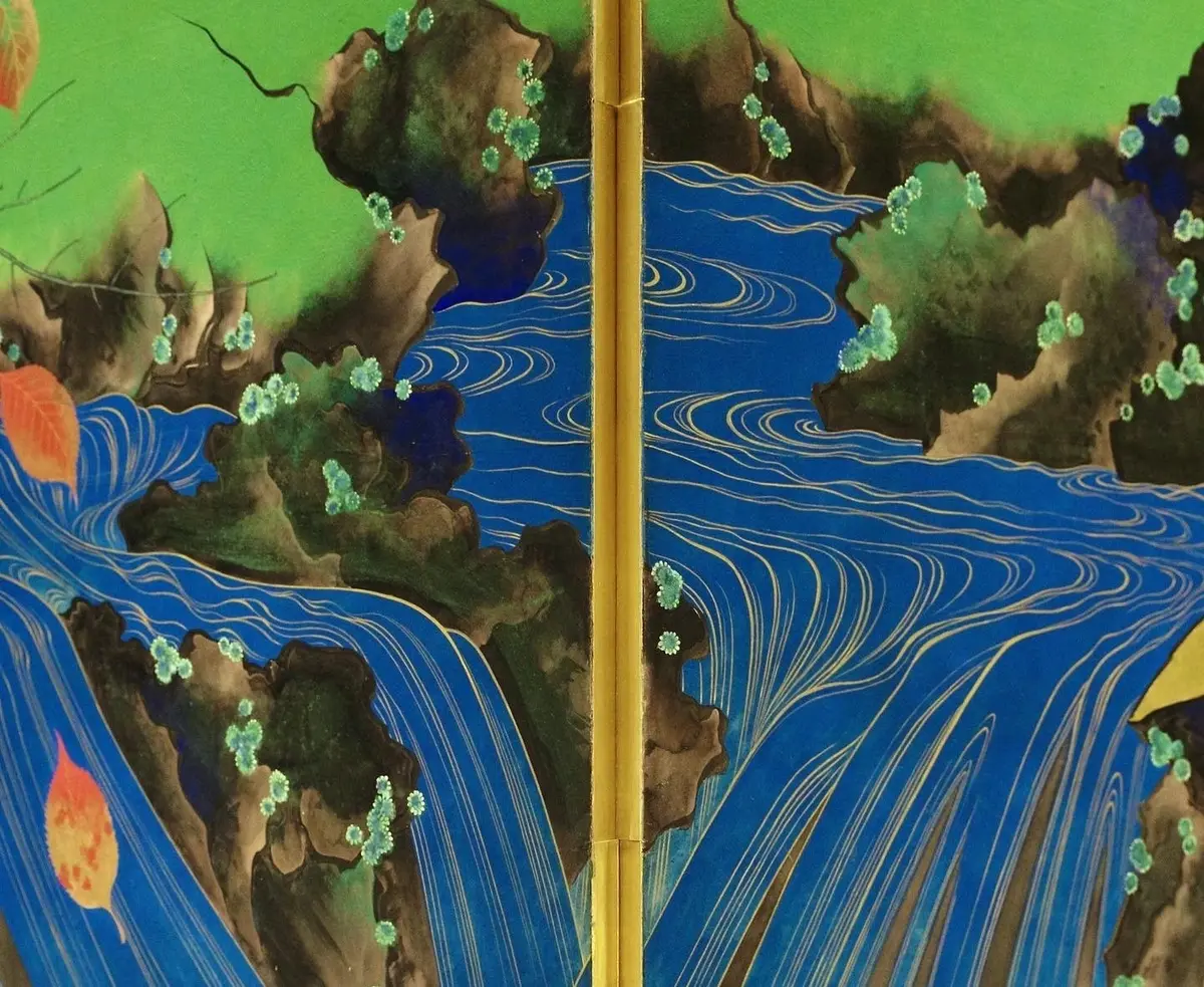 鈴木其一(1796~1858)は、江戸琳派の祖・酒井抱一の高弟として着実に力をつけ、時には師の代筆もしていた人物。抱一以上に写生的描写を研ぎ澄ませて琳派の造形に新風を吹き込むとともに、奇矯な表現を盛り込んだ作品も残しました。後者の代表が、昨年重要文化財指定となった『夏秋渓流図屏風』です。この屏風のおかしな描写の中でも筆頭といえるのは、えげつないほど青い水流でしょう。