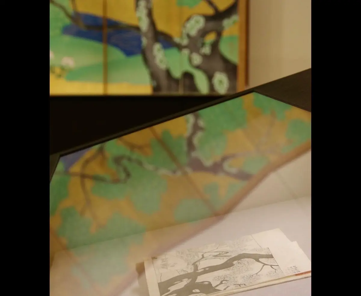 会場では、写生とデザインが入り乱れた本作のインスピレーションソースと目される円山応挙の『保津川図屏風』(重要文化財)、山本素軒の『花木渓流図屏風』とともに、抱一の『青楓朱楓図屏風』や『光琳百図』(写真2枚目)、狩野派などの先行作品も展示。「いったいなぜこんな屏風絵を…?」という謎解き気分で、お出かけください。