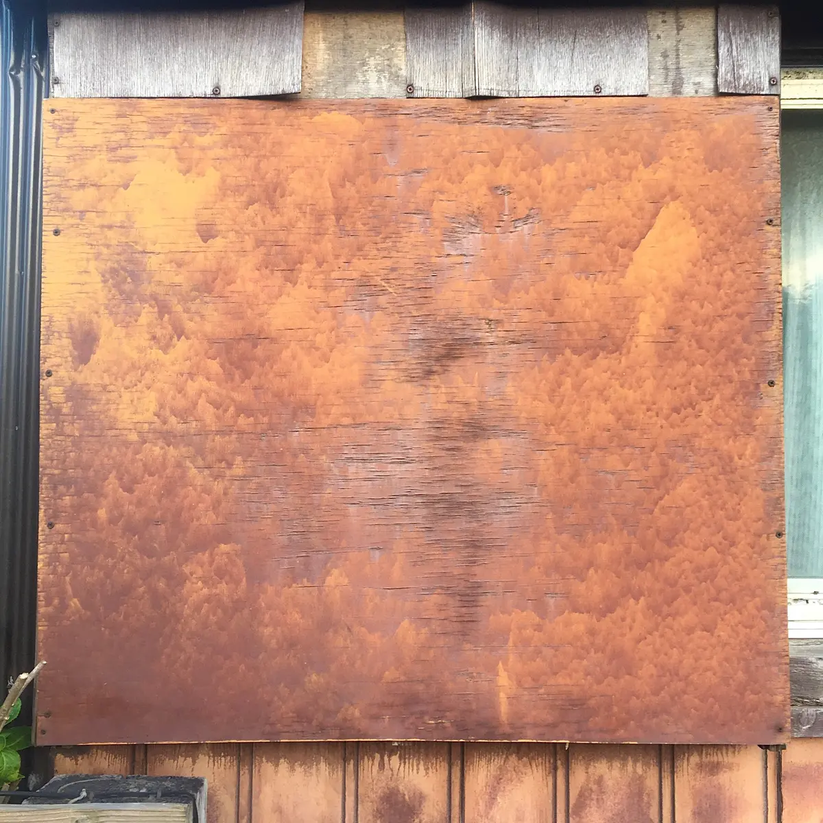 今年の秋は、紅葉らしい紅葉を眺めることなく終わりそうな予感。そんなときふと目に触れた東山魁夷の『秋翳』が沁みてきます……、と言いたいところですが、こちらは絶妙な朽ち具合の塗装板。鮮やかな入日色で、かなり芸術してました。