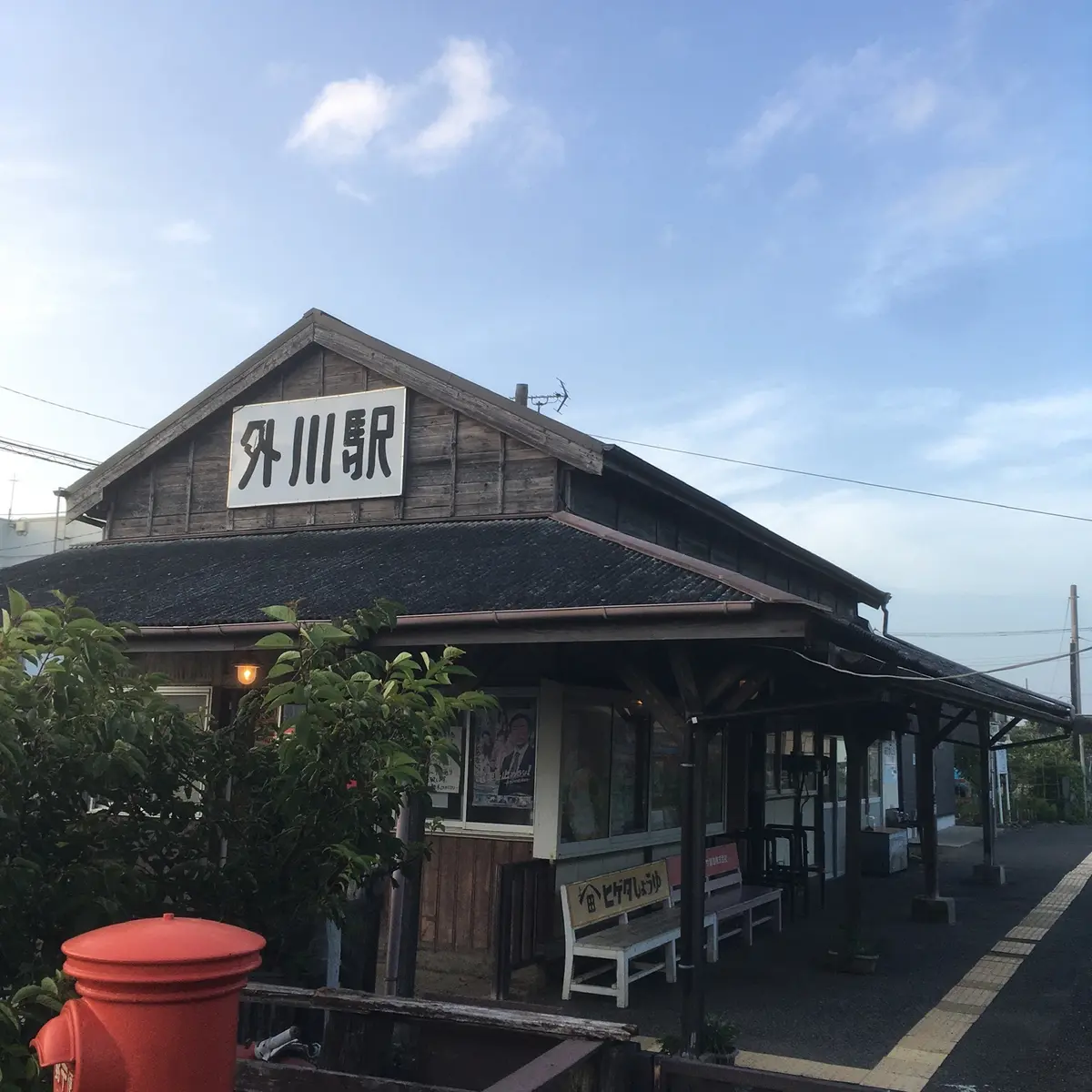 板を見つけた場所は、千葉県最東端を走る銚子電鉄の終着駅、外川駅。木造駅の舎は大正12年の開業以来の建物で、修築されながらも往時の雰囲気をよく残しています(2023年まで存続すればめでたく100周年!)。この板がいつから存在しているのかは不明ながら、"山燃える"美しい状態がこれからも続きますように。