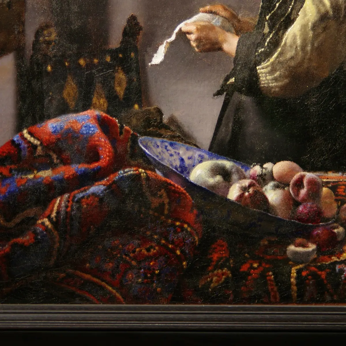 展示室では、修復後の実作品と修復前の状態の模写作品がほぼ同時に視界に入るのですが、脳が「待ってました、フェルメール!」と反応してしまったのは模写のほう……。それもそのはず、修復された本物は色が鮮やかで全体にメリハリがつき、以前の金の額縁ではなくオランダ絵画らしいシンプルな額装に替わっていたので、「最近描かれた作品」(≒模写)っぽく見えなくもないのでした。