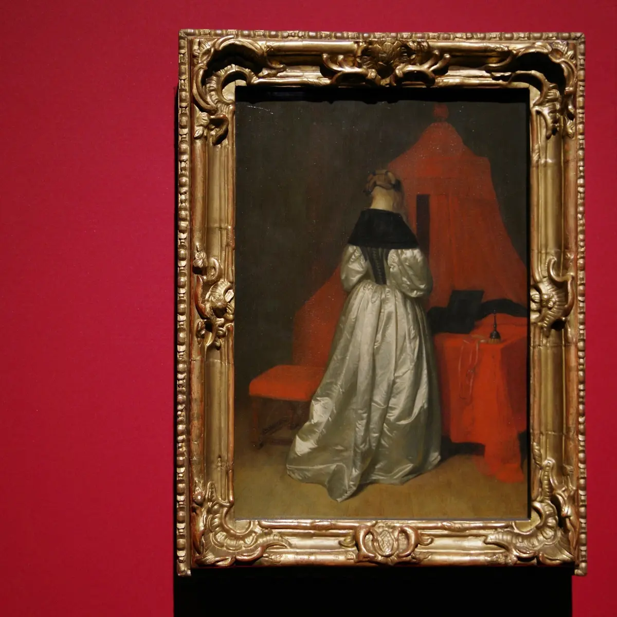 他の展示作品で気になったのは、ヘラルト・テル・ボルフの『白繻子のドレスをまとう女』。フェルメールの一歩先を行った風俗画の名手ながら、これまで今ひとつ愛着が湧かなかったテル・ボルフ。この絵はヴィルヘルム・ハマスホイのご先祖みたいな感じという、現代の視点丸出しの感想ではありますけれど、シンプルでほどよく謎めいた画面が好みです。