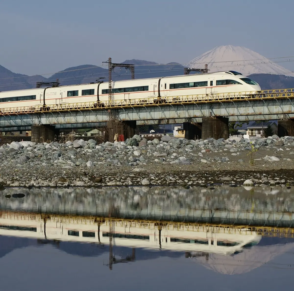 などと褒めるわりにはVSEは撮影していなかったので、最後の記録を試みることに。いざ始めてみると、展望席最前列の方々のお顔がわからないように撮るのはなかなか大変です。最終日の3/11は富士山が見えていたこともあり、酒匂川での水鏡からスタートしました。