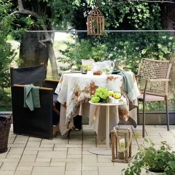 リネンクッションカバー¥4,400(ファイバーアートステューディオ)・中材¥5,500・ブランケット¥46,200(リソワ)/以上リビング・モティーフラタン製サイドテーブル「ヴィヴィ サイドテーブル」(φ44×H47㎝)¥52,800/ショップ アスプルンド 恵比寿(ヴィンセントシェパード)