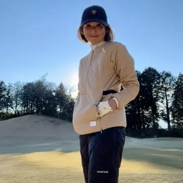 ウェアは冬の必須アイテム、テーラーメイドの中綿トップスとモンベルのダウンパンツ。ニットのサンバイザーはフェリージです。