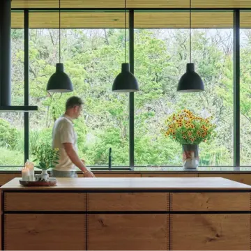 リビングの大きな窓の先には真っ青な空と深い緑に覆われた山々。さっきまで雲で覆われていたのに、刻一刻とドラマティックに表情が変わり、飽きることなく眺めていられる。ここは、フラワーアーティストとして活躍するニコライ・バーグマンさんが週末を過ごす、箱根の強羅にあるアトリエだ。