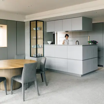 SNSなどでも話題のキッチンが「リシェル」シリーズ。人気の理由のひとつがバリエーション豊富なセラミックトップ。セラミックトップにしたくてこのキッチンを選ぶという人も多い。表情豊かで繊細な質感のデザイン性と熱・キズ・汚れに強い機能性が高評価の理由のよう。アイランド部分のカウンタートップは薄く、足元までムダなくたっぷりと収納を確保し、水平・垂直ラインを強調したすっきりとしたデザインが人気の傾向。使いやすさを追求した収納部分の細かい機能も国産ブランドならでは。コロナ禍を経てますます人気のハンズフリー水栓なども充実する。