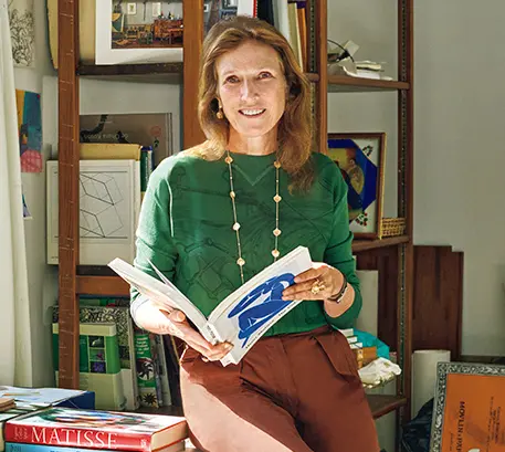 別荘の離れのアトリエでの、ソフィー。ここでひとりになって絵を描いたり庭や絵画の本に見入ったりすると、創作意欲をそそられるそう
