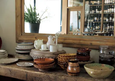 料理家として活躍する渡辺有子さんが’17年4月にオープンしたセレクトショップ。店内には作家ものの和食器をはじめ、渡辺さん自らが買い付けるヨーロッパの古い洋食器やカトラリー、オリジナルのリネン類やお菓子などが並ぶ。「器は料理が映えて、盛りつけて完成するもの。あくまで料理メインで考え、実際に使ってみていいな、使いやすいなと思う作家の器を扱っています」。陶磁器、木工、ガラスなど、扱う作家は10 人ほどの精鋭ぞろい。料理家としての鋭い目線で選んだ、日々の家庭料理を間違いなくおいしそうに見せてくれる、頼もしい器ばかりだ。