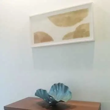 「この木製の灯台と船のオブジェはとても好きなのですが、これだけだと色合いが控えめでちょっと地味。涼しそうではあるけれど夏のワクワク感が物足りない気がしたので、ハワイアンフェアで手に入れたビタミンカラーの絵を加えてみました。ちょっととぼけた感じの陽気さが気に入っています」