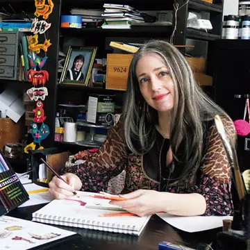 ❶デザイン画を描くミシェルさん。ミュージシャンの夫と暮らすシックなロフトは、たびたびメディアで特集されている。