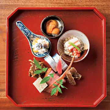 魯山人作『染付福字平向付』にノドグロの焼き物とカラスミをのせて。この“福”の文字はバカラ社グラスデザインなどにも取り入れられる人気の意匠。『あらや滔々庵』の特別コースで出されるひと皿から