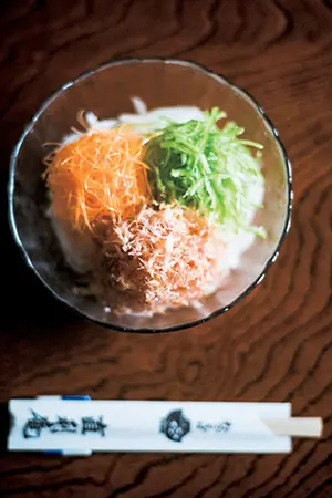 暖簾(のれん)をくぐるといっせいに「いらっしゃいませ」の声がかかる。133年の歴史をもつ老舗らしい声の張りとタイミング。名物のわんこそば(19:30LO)目当ての客も多いが、39年前から夏の人気商品となっているのが「つめたい野菜そば」。シャキシャキの野菜とそばのコシに酸味を加えただしがからまり絶妙な味と食感を生む。古くていい店が仕掛ける新感覚のおいしいもの。ここにしかない小粋な清涼感で満たされたい。