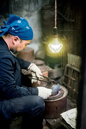 すべて手作業で製作するため、型取りから仕上げまで手をつくす時間は丸2カ月。鉄瓶は月20個仕上げるのがやっとという。まもなく16代盛久を継ぐ鈴木成朗さんは、グラフィックデザイナーとして東京で活躍した経歴をもつことからさまざまなコラボを手がけ、シンプルでデザイン性の高い作品で注目を集めている。