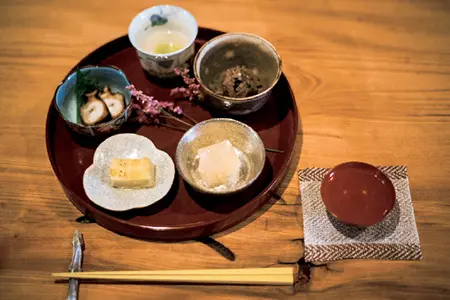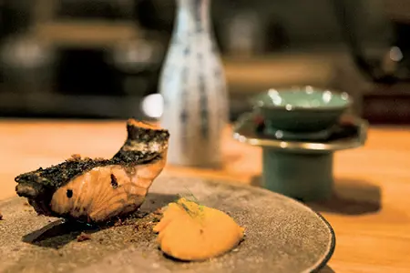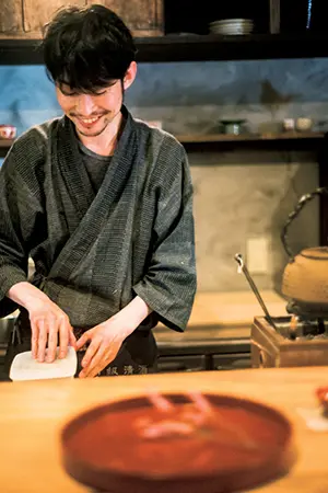 完全予約制、一枚板の立派なカウンターに6席だけという隠れ家的な庵室は、戦後の建物を改装したもの。土や木のぬくもりが感じられる店内で、岩手の食材を中心としたおまかせのコース料理とともに、ゆったりと美酒に向き合う時間が楽しめる。店主で調理人の石川優太さんは、岩手の酒「南部美人」のラベルデザインも手がけるほどの絵心の持ち主。岩手の気候風土や季節感を、器の中にも麗しく表現する。
