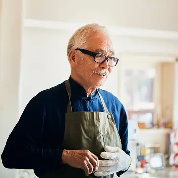 誕生日に板谷さんからもらったエプロンをつけたダンディな徹さん