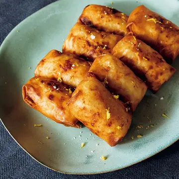 ❹③の上にA、②をのせて広げてから、ロール状にきつく巻いてたこ糸で縛る。オリーブオイル大さじ1(分量外)を熱したフライパンに入れ、強火で表面に焼き色をつける。余分な脂をふき、白ワインを回しかける。
