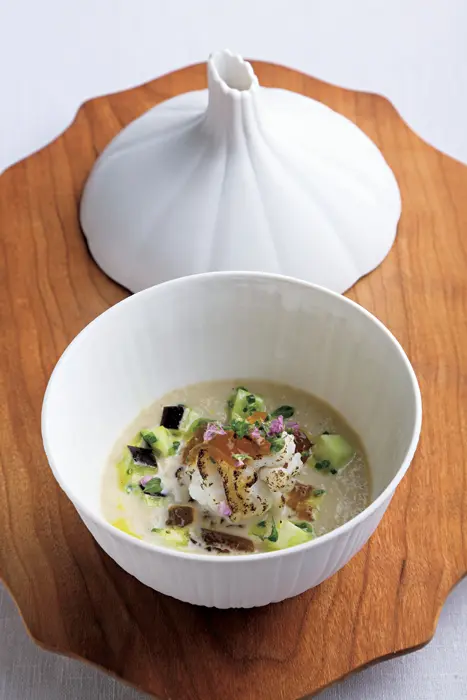 「和食と違ってフランス料理は素材の味や香り、色を多彩に組み合わせながらバランスをとって作る料理。京都の食材をたくさん使っていますが、フランスのエスプリで作った生粋のフランス料理です」。初秋は鯖と柿、秋なすと鱧といった旬の食材が多彩な香りと味わいの重なりをもって供される。
