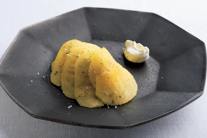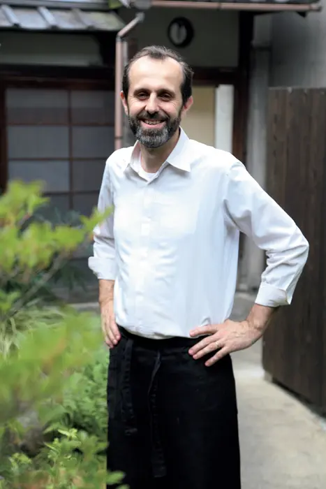 御所南の静かな環境にしっとりたたずむ築150年の町家。暖簾をくぐり、中に進むと趣のある庭、土壁や木などの自然素材に包まれた心地よい空間が広がり、割烹を思わせる一枚板のカウンターとしゃれたダイニングが迎えてくれる。食材はシェフのステファン・パンテルさんが毎朝大原の畑で直接収穫した野菜をはじめ、国内外から取り寄せ厳選したもの。それを自身の解釈や感性をもって調理し、ステファン流フランス料理に仕上げている。
