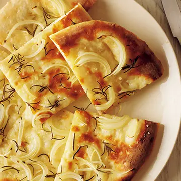 2.作業台に打ち粉をして生地をのせ、手粉を少なめにつけて生地を丸め、7等分に分割する。オリーブオイルをつけた手で生地をそれぞれ丸くまとめ、麵棒で軽くのばし、中心から外へ向かって厚みのある円形にのばす。