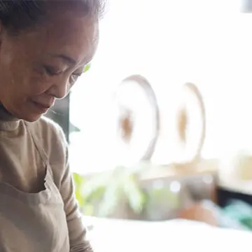 5.作業台に打ち粉をして生地をのせ、手粉を少なめにつけて生地を丸め、2分割する。打ち粉をした麵棒で生地をトントントンと軽く押さえてのばし、麵棒や手で中心から外へ向かって薄く丸くのばす。指先でたたいて、生地に凹みをつける。