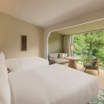 玉露、煎茶、抹茶、冷茶など、好みの味わいとともに世界遺産でのんびり過ごす贅沢なひと時を。屋外にいるような開放的なスペースは、冬には、目の前にサザンカの艶(あで)やかな色彩が広がり、その美しさにも心奪われる