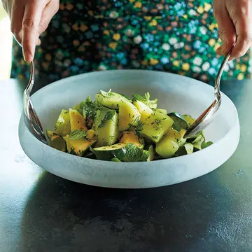 ❶メロンは種をとり、くりぬき器で果肉を14〜16個、丸くくりぬき、Aであえる。残りは皮をむき、5㎜厚さのひと口大に切り、Bであえる。