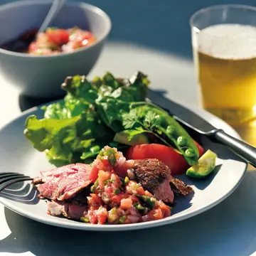 ❸①の肉の皮目を下にし、弱めの中火にしたBBQグリルにのせて焼く。表面を焼き固めたら返して身の側も焼き、弱火にしてじっくり中まで火を通す。焦げそうな場合はアルミホイルで包む。