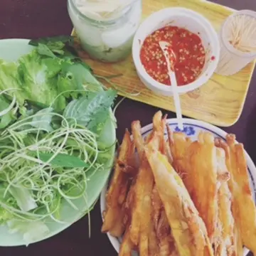 ブンチャーの店では、サツマイモとエビのフライも。揚げ春巻きも美味