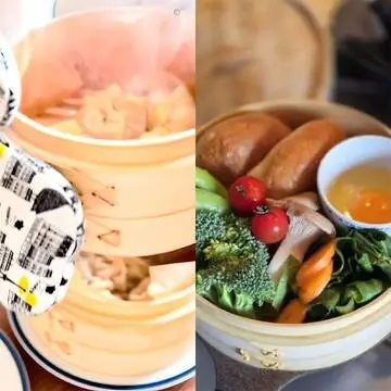 ❺①の残りの桃を縦半分に切り、皮をむいて種をとり、下の部分を少しだけ平らにしてお皿に盛りつける。④を盛りつけ、好みでミントや香菜を添える。
