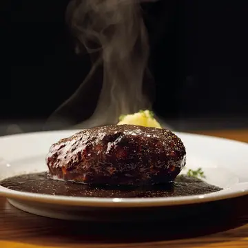 薪の香りをまとった鹿肉のローストと、とろとろの賀茂なすにブルーベリーソースを添えた「鹿肉 賀茂なす ブルーベリー」
