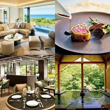 木造建築のメイン棟は、木材を活用して凛とした中にもぬくもりを感じる造り。壁面には栃木県産の大谷石も多く使われている。24室ある客室は、和洋折衷の優雅さはそのままに、すべて異なるデザイン。大浴場のほか、全室に自家源泉の温泉浴室があり、最も広い「ふふラグジュアリープレミアムスイート」では、部屋の3分の1くらいが半露天風呂という贅沢ぶり。「日本料理 節中」では、器や食材にこだわった和洋折衷の美食が楽しめる。オリジナルの紅茶やアメニティ、部屋着など、細部まで“華麗”さをコンセプトにしたしつらえを楽しんで。