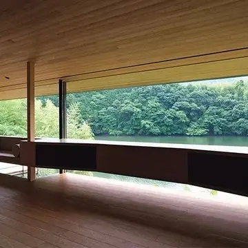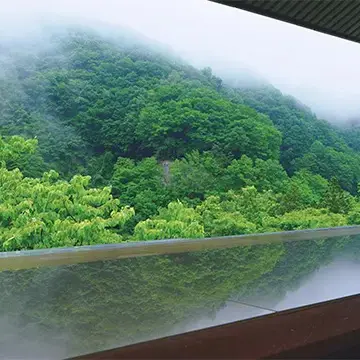 標高900mの国立公園の中にあり、松川渓谷沿いに立つこちら。紅葉の美しさで有名だが、一番のおすすめは木々の生命力あふれる初夏だ。20mにもおよぶロビーの大窓は春~秋の季節は全面開放され、渓谷一面の新緑の美しさ、風を肌で感じて、川のせせらぎの音、自然の匂い、などなど五感を存分に癒してくれる。
