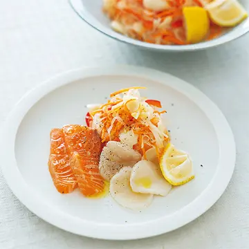紅白なますが、優雅にドレスアップ。甘酢漬けにしたごく薄切りの大根と、水とオイルだけで炊いたピュレを合わせて。「せん切りより手軽」と、冷水さん。