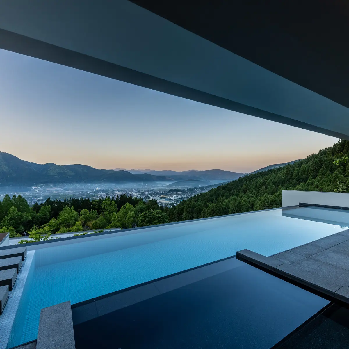 客室は、温泉付きの特別室から1名用の和室まで、趣の異なる部屋が揃う。客室からは、別府の山並みや街の風景を望むことができ、朝は柔らかな光に、夜には静かな灯りに包まれて穏やかなひと時を届けてくれる。